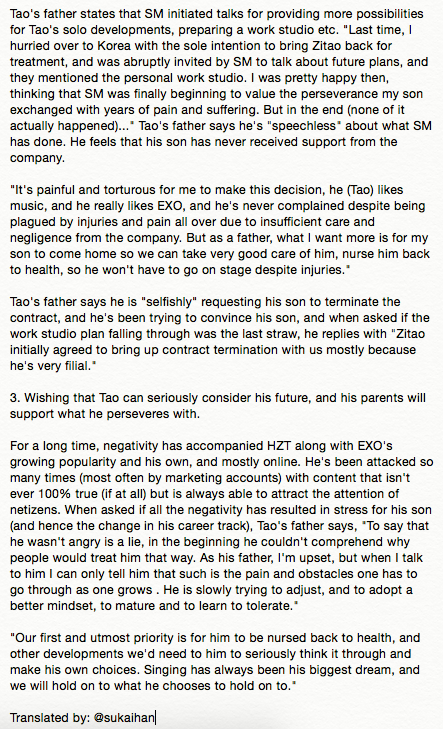 I’m a bit late on this because I do pretend to have a life, but remember those rumors about Tao leaving EXO that sounded like any other rumor going around? Well, apparently they actually had some legs to them, because Tao’s dad posted the letter above, and SM Entertainment validated that the conflict exists by confirming it in a statement.