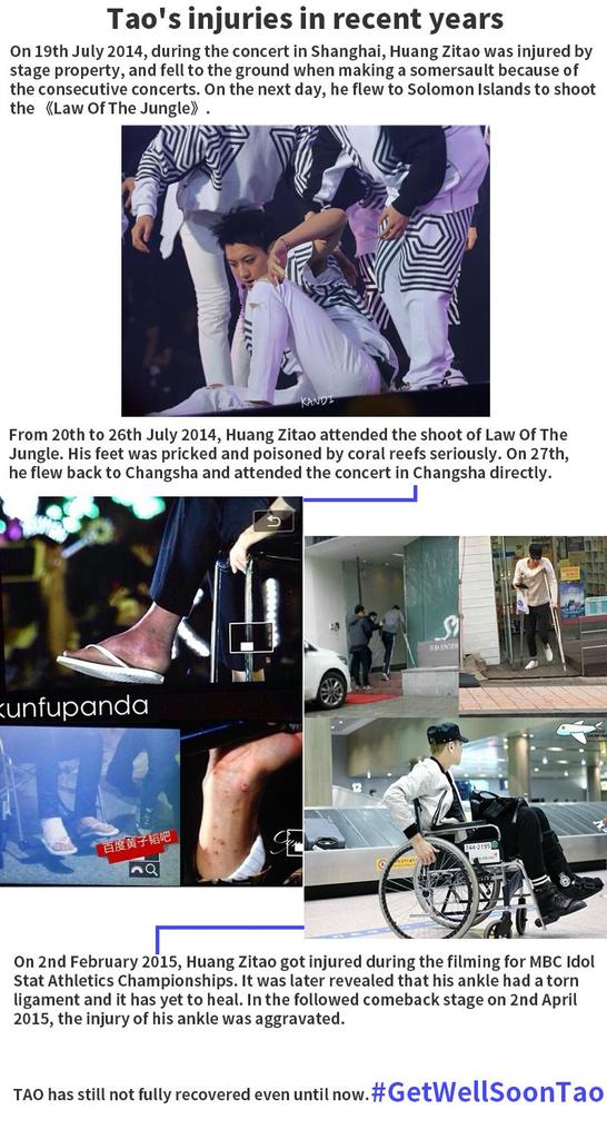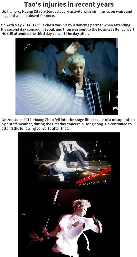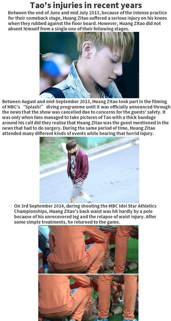 In relation to Tao’s father’s claims, here’s a photo set which fans are claiming documents Tao’s injury history. Note that I have no idea what is true or false in this, but the pictures of the injuries themselves look … gross.
