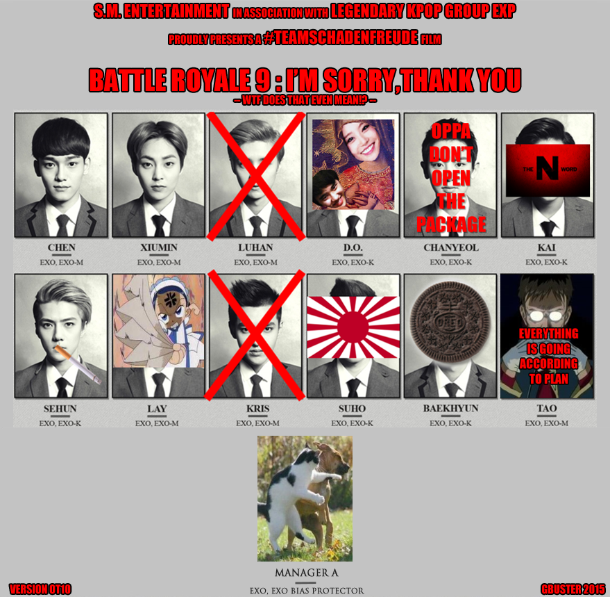 Now there’s technically no room in the EXO Battle Royale picture for this dude, but I’m just saying that an exception can be made if necessary while we wait for Tao to cry out a window long enough that the media can report on his status.