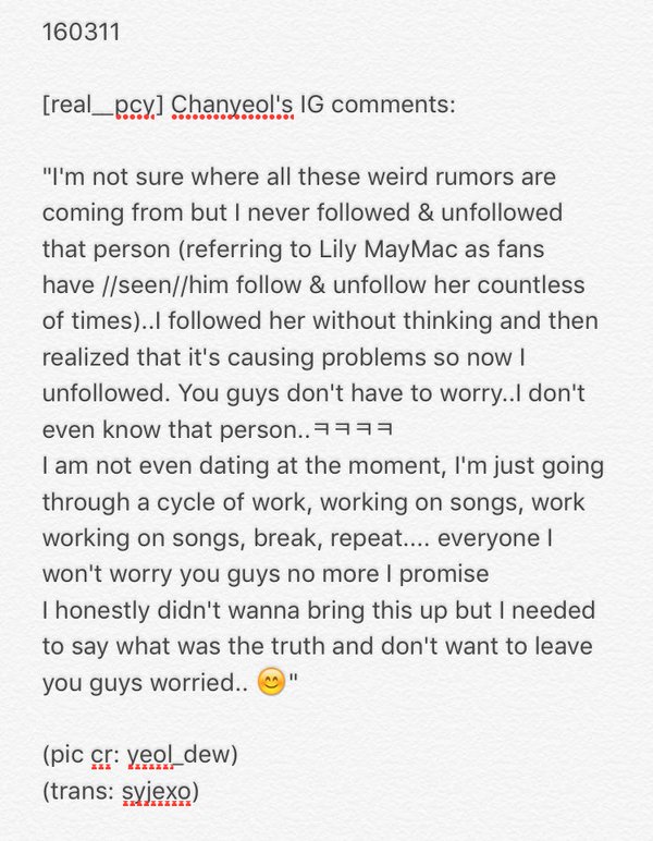 Last month, EXO-L harassed model Lily May Mac badly enough over her receiving a follow from Chanyeol that it made international news, and a couple days ago Chanyeol apologized (???) for causing confusion among fans.