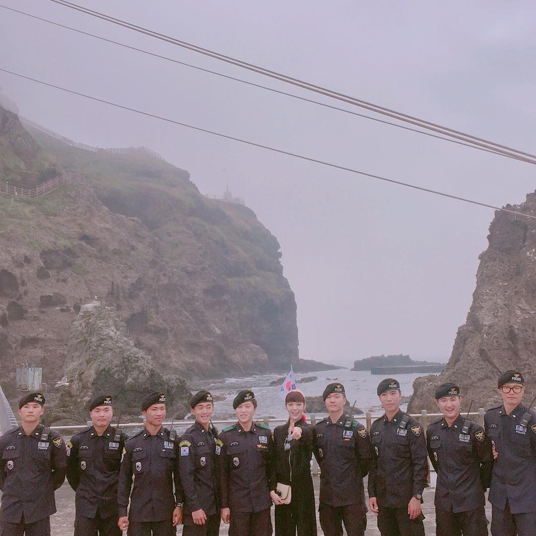 In one particular photo, she stands shoulder-to-shoulder with South Korea’s Dokdo Guards, along with a caption that says, “Dokdo is our land. Thank you. I feel reassured.”