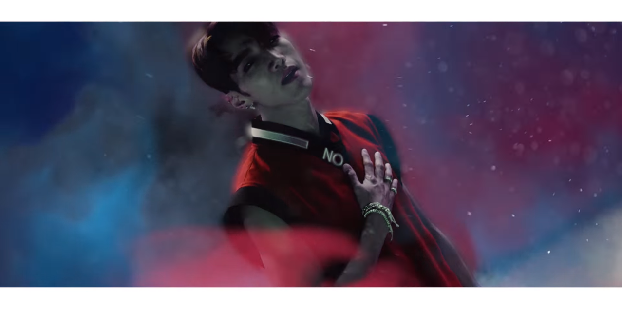 Moving past that, though, I really liked the bold red and white scenes. Not only because he actually looks attractive there, but because it stands out within the music video without looking out of place. This is probably due to the way they tied in red throughout, making multiple sets and scenes appear completely cohesive while still being entirely diverse. From heavy red lighting to cosmic swirls to images of bursting fireworks in the background of the choreography scenes, it really helped tie everything together visually.