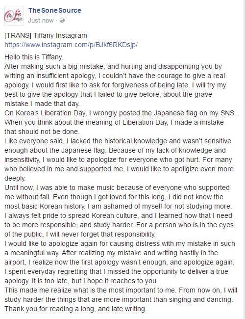 Tiffany released another apology for being a dumbass and starting that flag controversy and wanting Japan to colonize Korea again or whatever the fuck netizens started saying.