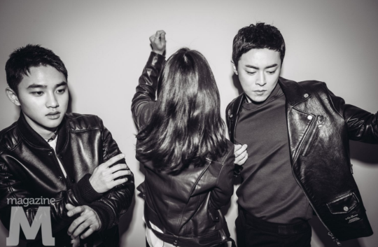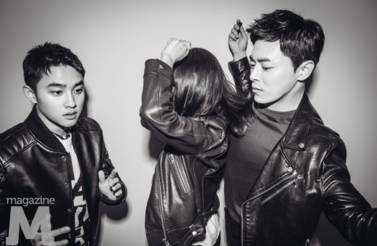 Me (D.O.), Park Shin Hye, and Jo Jung Suk messing around for Magazine M