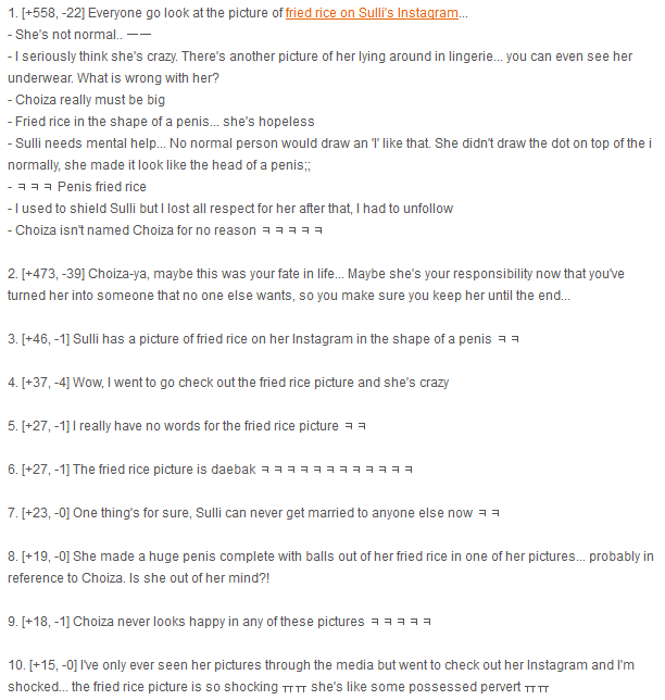 So I actually didn’t write last night and took the time to catch up on sleep, and apparently I missed Korean and international netizens getting their genitals lit on fire by Sulli making a dick out of fried rice and generally having fun on vacation.