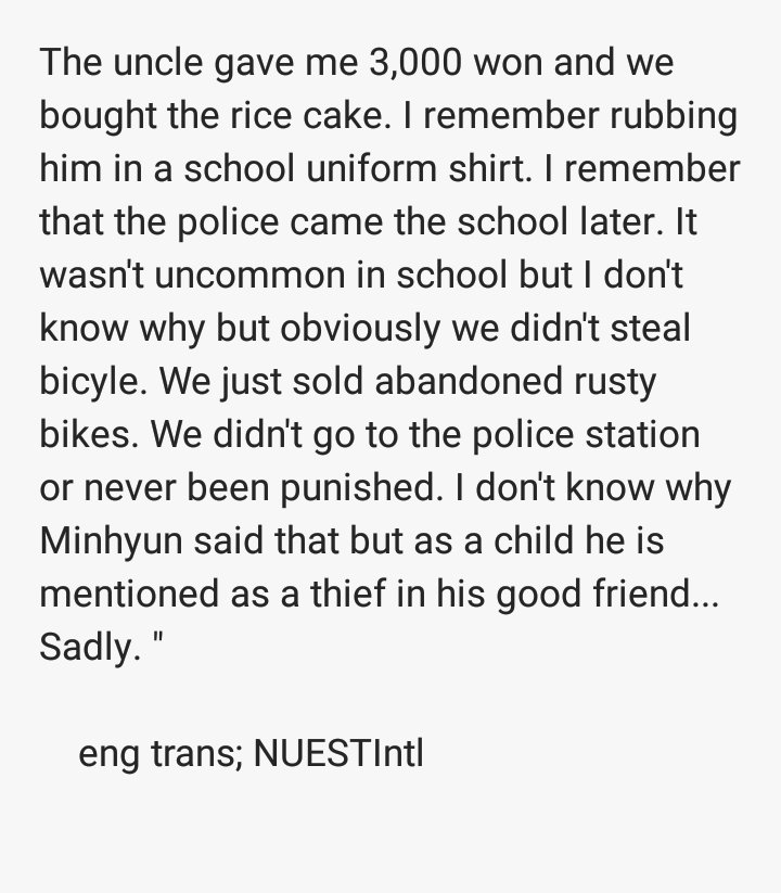 “I am Hwang Minhyun’s 9th-grade homeroom teacher, and I guided Hwang Minhyun in 7th and 8th grade as well. Currently, I am still working at the same school. There have been several news reports on Hwang Minhyun’s bicycle theft story. To summarize, the story Hwang Minhyun told on the radio was exaggerated. I believe he told that story because radio programs require some exaggeration on impactful stories that highlight a new experience. I watched him grow for 3 years in middle school, but from what I know, that never happened. After having watched him for 3 years and staying with him for 1 year as a homeroom teacher, he spent his middle school days diligently and beautifully. I’m writing this to share the truth to all those supporting and believing in Hwang Minhyun, as he is suffering emotionally from the spread of false information. There are probably people who think I’m writing this because Hwang Minhyun contacted me somehow. But, after he graduated middle school, I haven’t been in touch with him until now for various reasons such as busy schedules and changed phone numbers. I’m only watching my student live his life through the internet and broadcast television. I’d like to remind all those reading this post. Hwang Minhyun never stole anything while he was in middle school, he enjoyed his middle school life as a regular student. Anyone who attended school with him at the time or worked at the school will agree with this fact.”