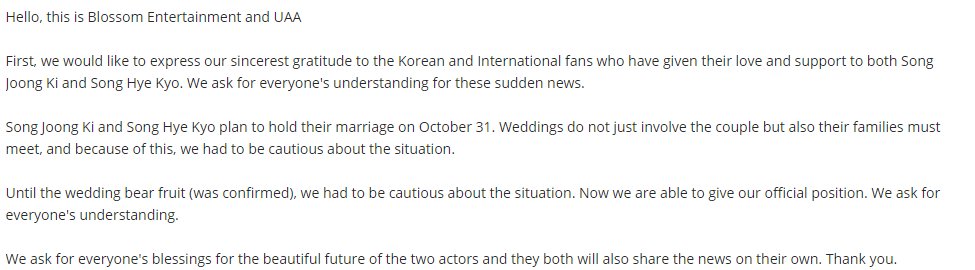Song Joong Ki & Song Hye Kyo are getting married in October, as both their agencies have confirmed the news.