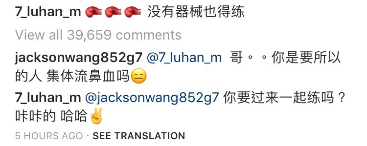 Luhan replied to Jackson, inviting him to come ‘workout’, “Do you want to come over and workout together? Haha.”