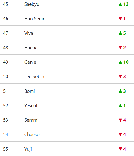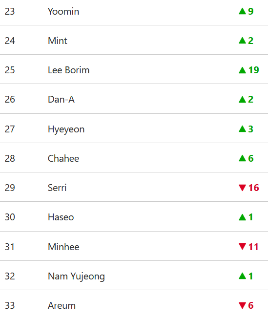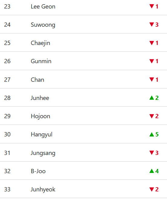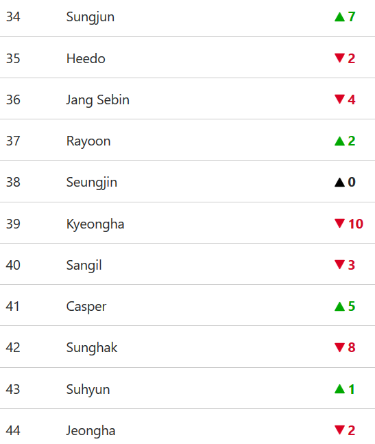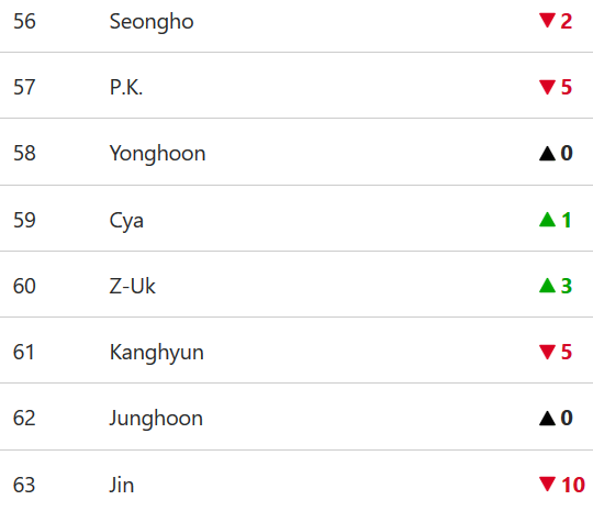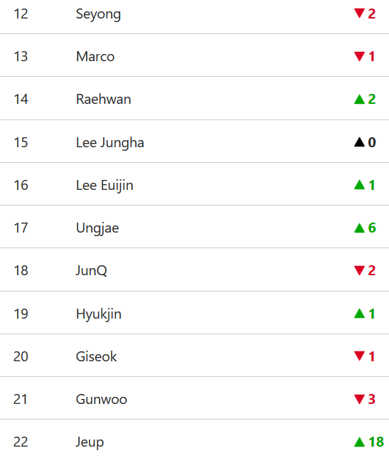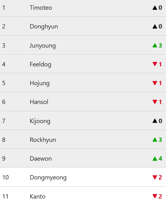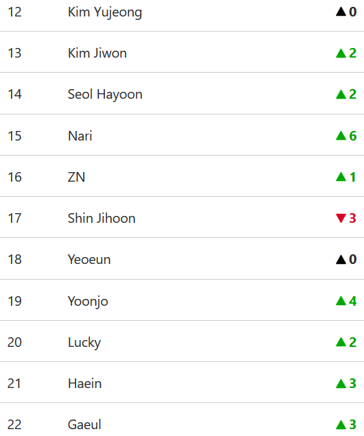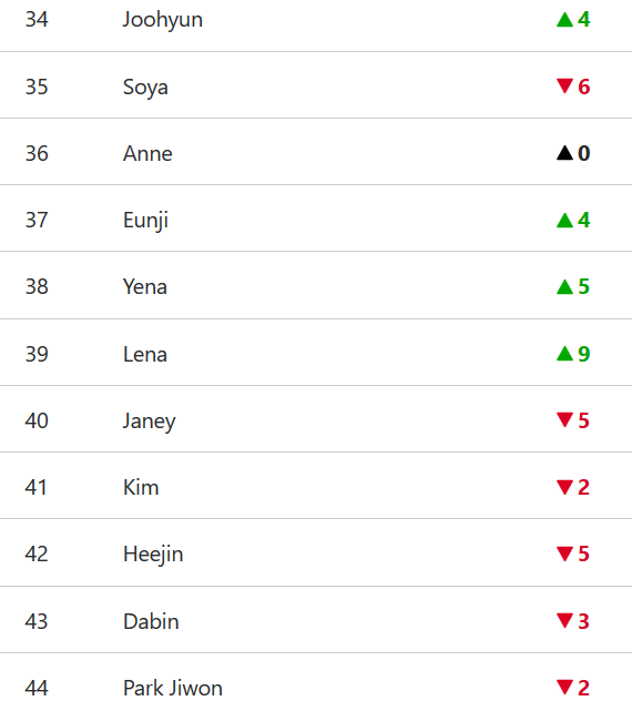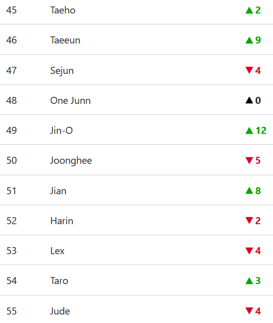 Regardless of how they perform, it’s the rankings that matter in the end. So once again, here are the female and male ranks, this time with their change from last week.