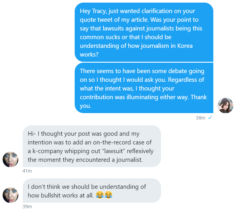 After I published my opinion yesterday about many K-pop fans bizarrely siding against journalist Jae-Ha Kim, journalist Tracy Robey chimed in by adding her experience in being threatened with a lawsuit by a Korean company for her reporting.
