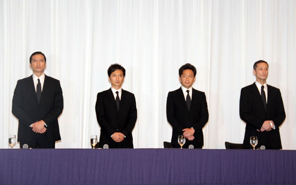 The members of TOKIO came out and are making their apology to the victim and her family by bowing in unison.