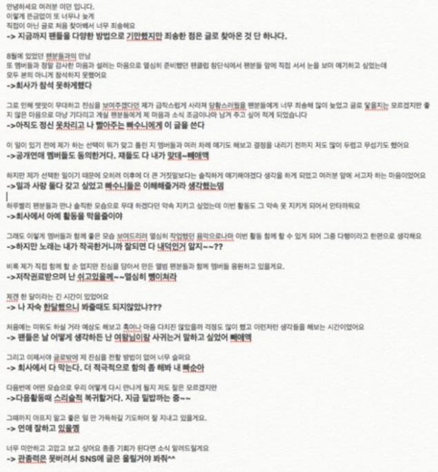 “Afterward… even though I said I wanted to show you my truthful side confidently, I disappeared without warning; so I am writing in the hopes that even just a little bit of my apologetic feeling and my whereabouts will touch the fans who are simply waiting for me with troubled hearts, even though it’s so late and I’m not sure if this will reach you.”