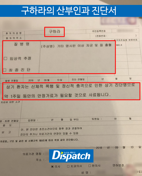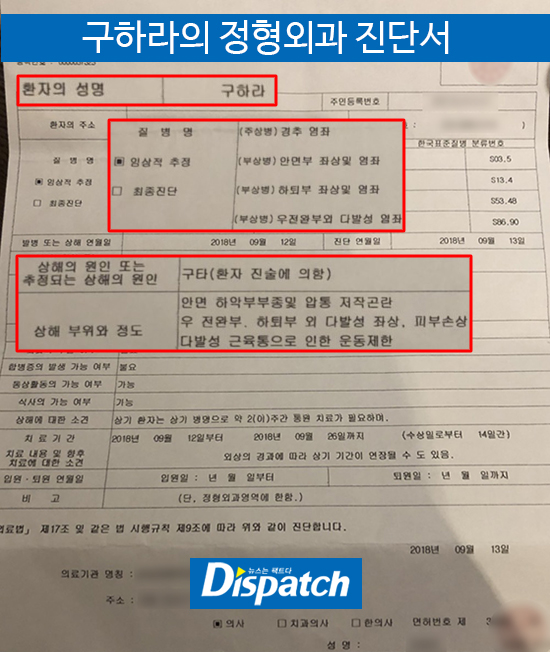Goo Hara shared her diagnoses from the gynecologist and orthopedist. The diagnosis from the gynecologist reads, “uterus and vagina hemorrhage.” The orthopedist’s presumptive diagnosis lists, “cervical sprain,” “facial contusions and sprain,” “lower leg contusions and sprain,” “right forearm and additional sprains.”