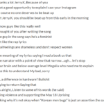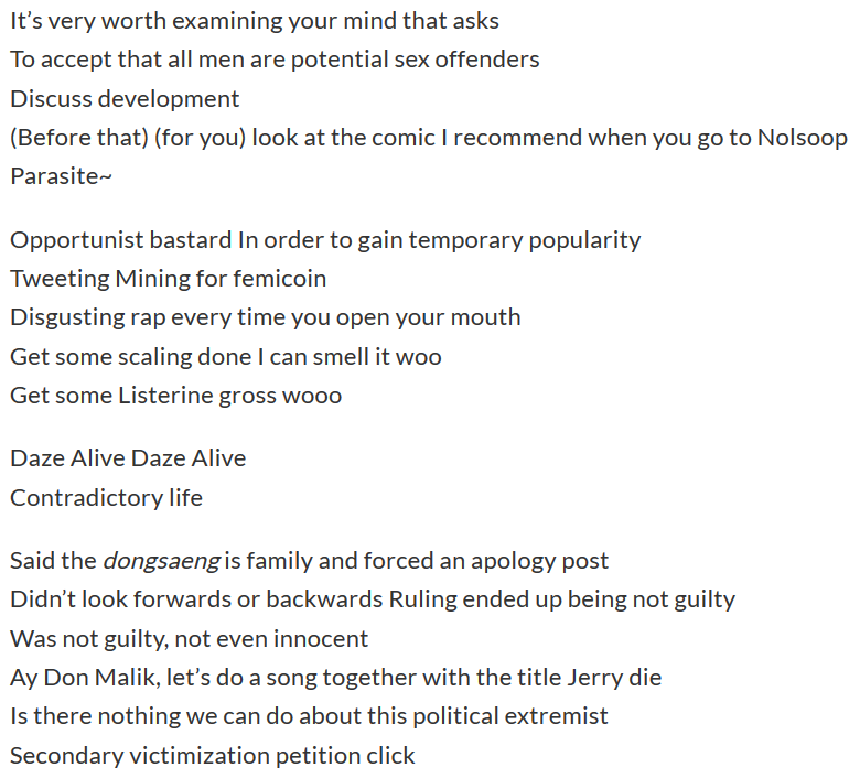 I’ve addressed the radfem communities in Korea before as well, and while one can understand their rage and anger, it’s also quite easy to condemn their more extreme actions, homophobia, and transphobia. So I’m certainly no fan of them, but the false equivalency San E is attempting here (even if you believe his explanation for whatever godforsaken reason) is still misguided.
