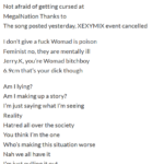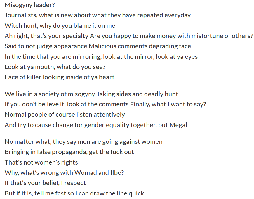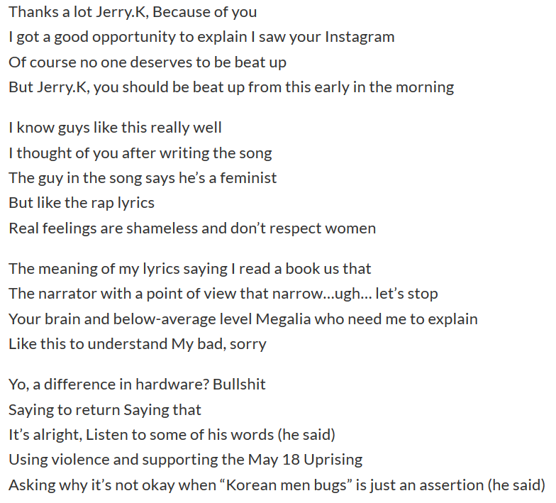 “‘Feminist’ is not a song expressing hatred towards women. If you listen to the song one more time, you’ll see that the narrator in the song is not me. I enjoy books and movies with this meta perspective and I thought I had set up my song so that people would understand what I was doing. It seems that my set-up was weak. I chose this theme in order to speak strongly against the societal issue of hatred against both men and women. The original meaning of the song is to criticize people like the narrator in the song: people who say that they respect feminists, gender equality, and women on the outside but on the inside are hypocritical and contradict their words in the way they act and speak to women. I hope that this explanation can bring comfort to my friend and people who think like her.”