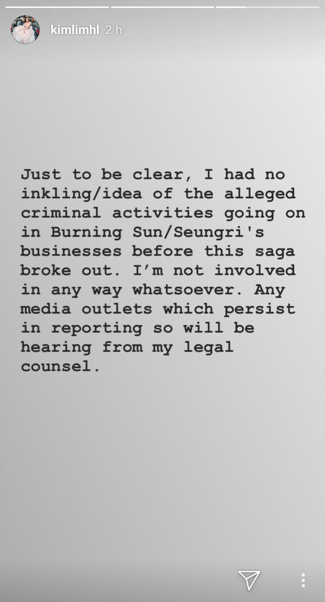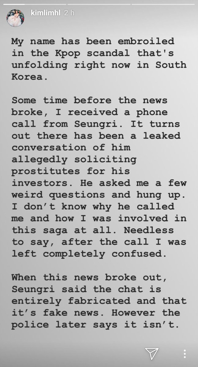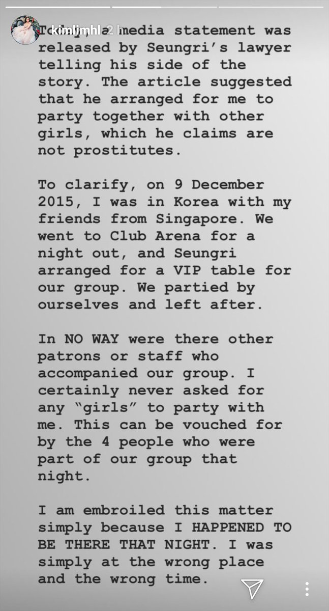 So Kim Lim is saying it’s true that she is/was friends with Seungri, it’s true that she went to Arena, and it’s true that Seungri got her a table. However, she strongly disputes her involvement in his defense for the prostitution scandal that the girls they were discussing were for her or her group. Furthermore, she states she had zero knowledge of the alleged criminal activity and stated that before the scandal broke she received a weird call from Seungri about the incident.