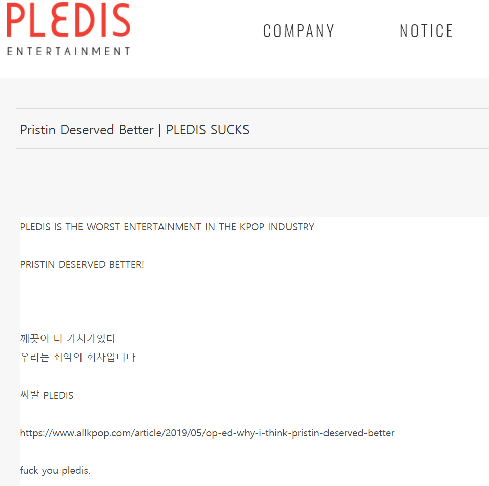Hours ago, the official site of Pledis Entertainment was hacked by what appears to be a disgruntled PRISTIN stan, at least judging by the contents of official notices posted by the hacker.