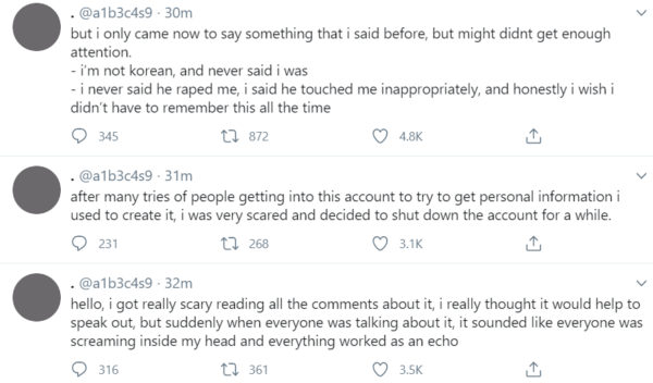Obviously I don’t know exactly what happened, but his statement is definitely bizarre. They are quite direct allegations, not rumors, and given that they’re anonymous, I’m not sure how one can deny meeting them or going to certain places. Then he transitions into promoting his upcoming solo, which is an odd choice for something of this magnitude and doesn’t reflect well on him.
