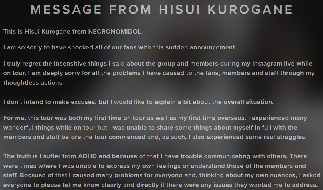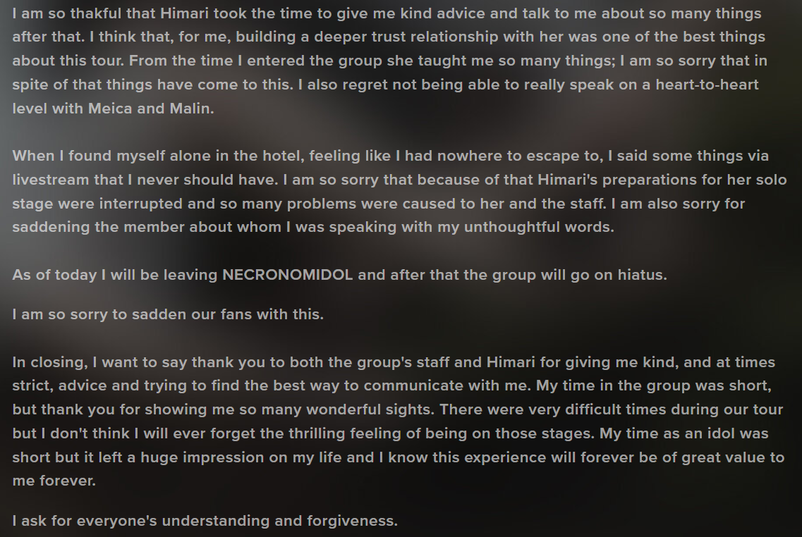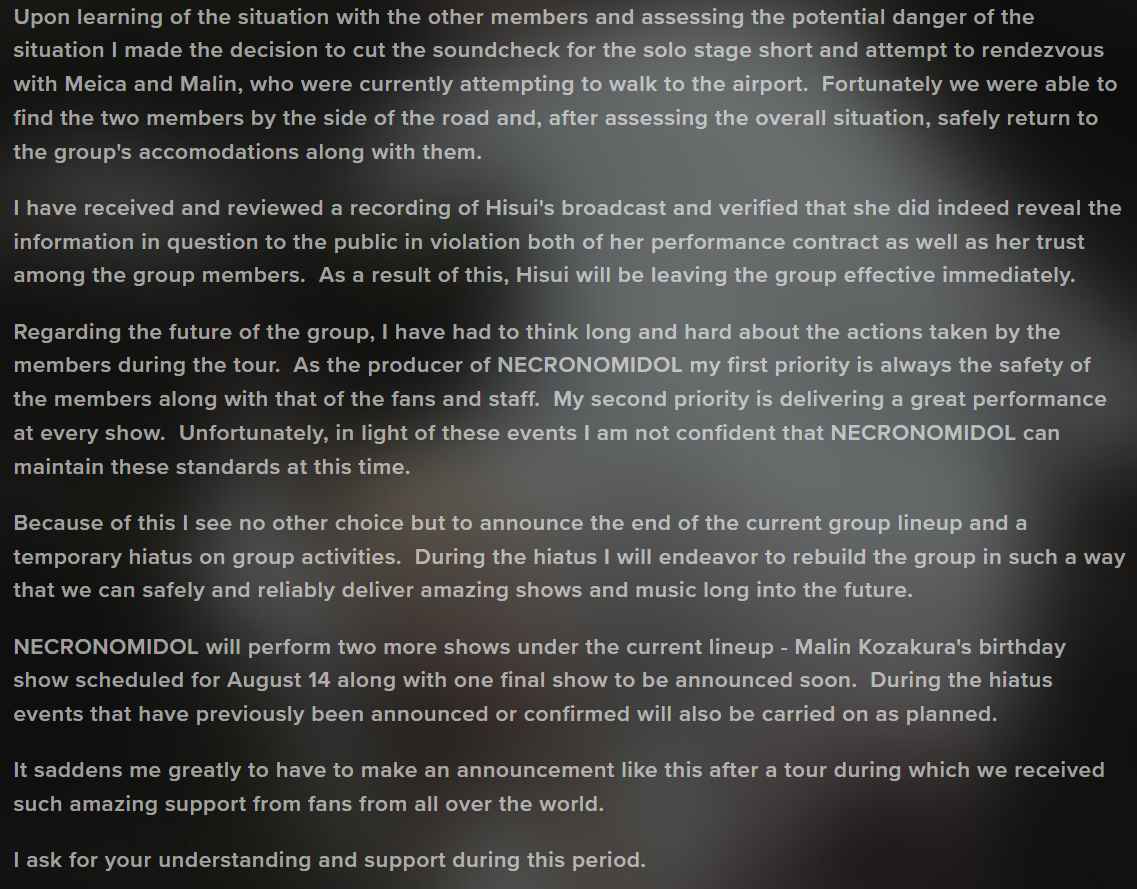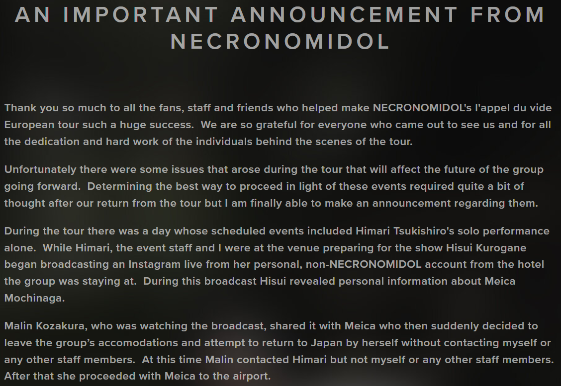 In week-old wild-ass Japanese alt idol news, NECRONOMIDOL recently lost a member and declared an indefinite hiatus after one member basically doxed another member on a live broadcast.