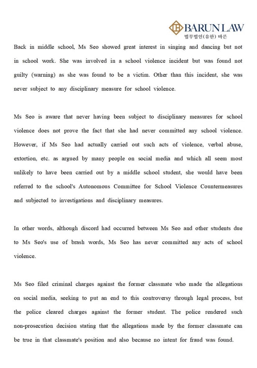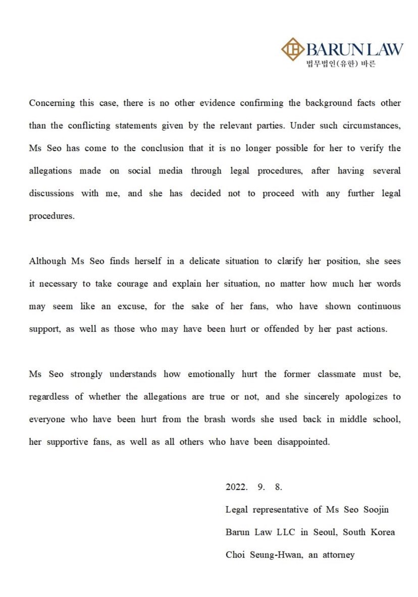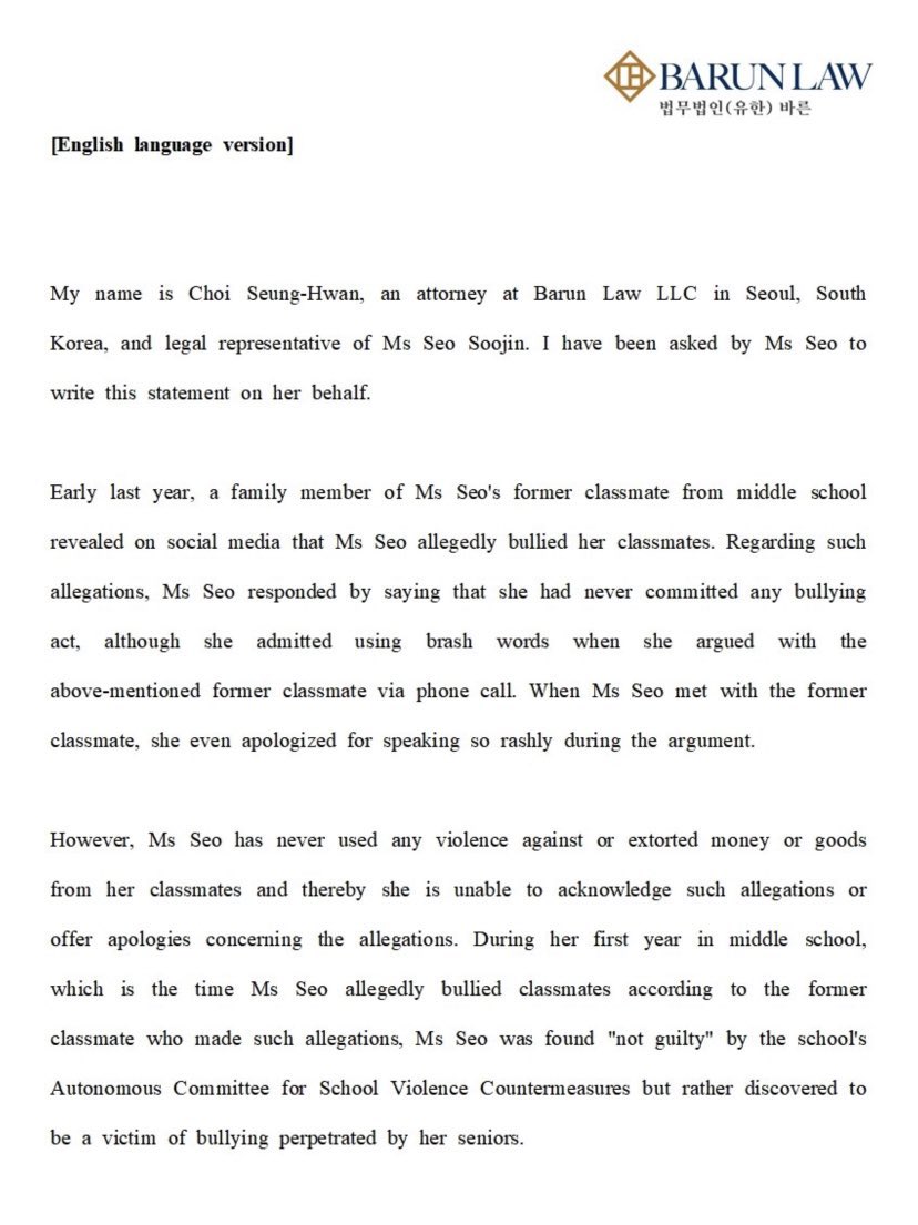 Releasing a statement in Korean and English, her lawyers admit she used harsh words but that was all she did, continuing to deny any other allegations. They say there was a limit to evidence in the case so legal action is difficult, but emphasize that she was acquitted by a school violence committee and was in fact bullied by unnamed seniors. Additionally, Soojin apologizes to everybody who had been hurt by her.