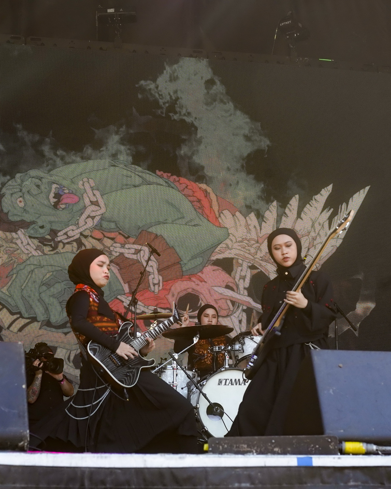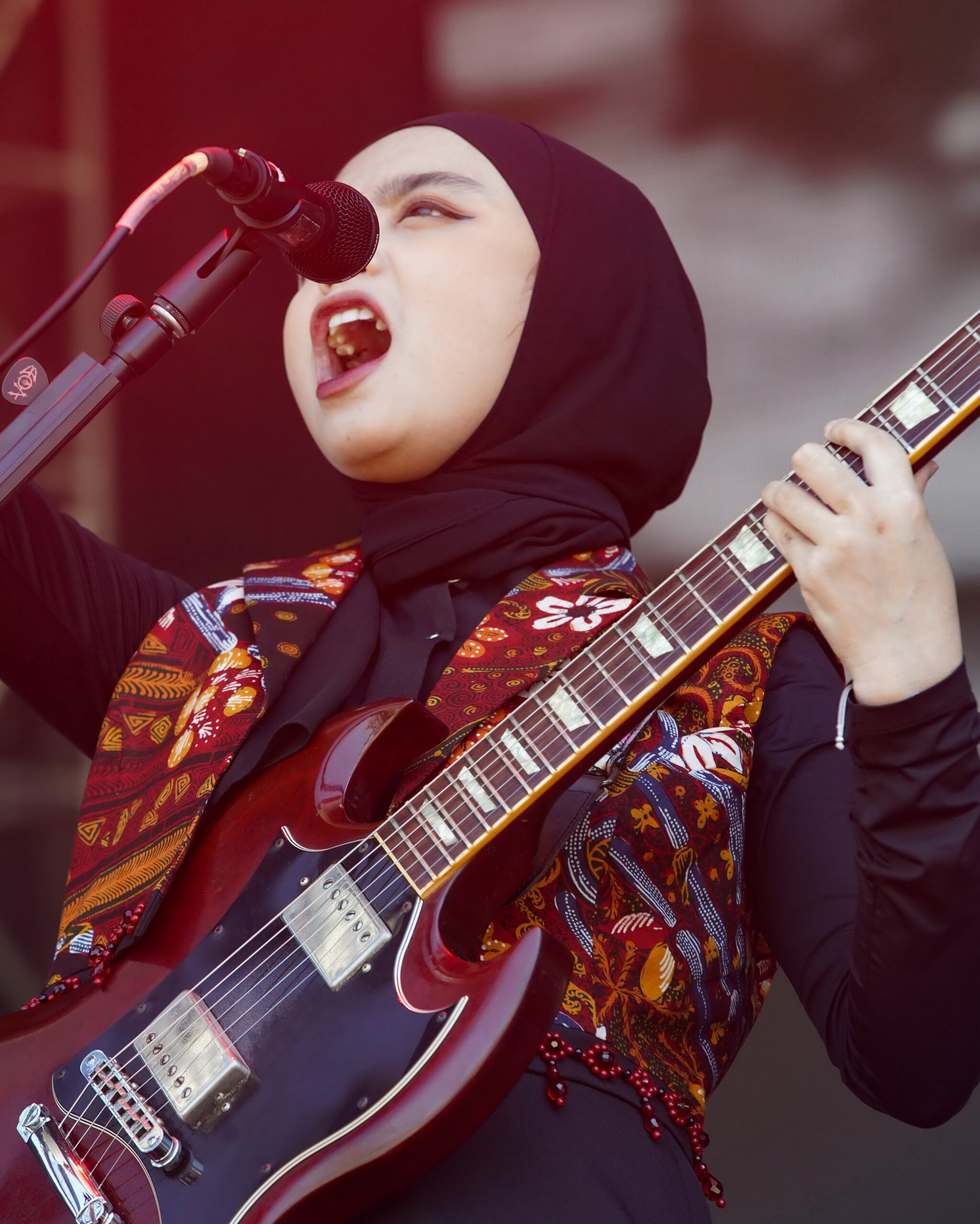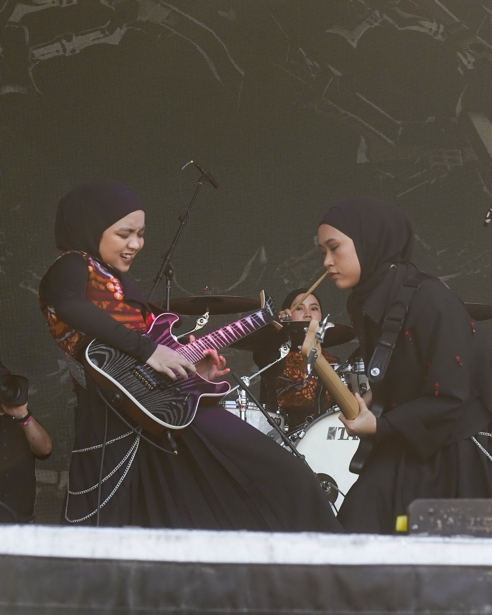Oh, you don’t know Baceprot? Baceprot is a phenomenal metal band from Indonesia, and seeing three Javanese women in hijabs absolutely wail on stage and deliver a most amazing performance was a treat. We decided to try to get a few more artists from the Honda Double Happiness stage, and Baceprot did not disappoint.