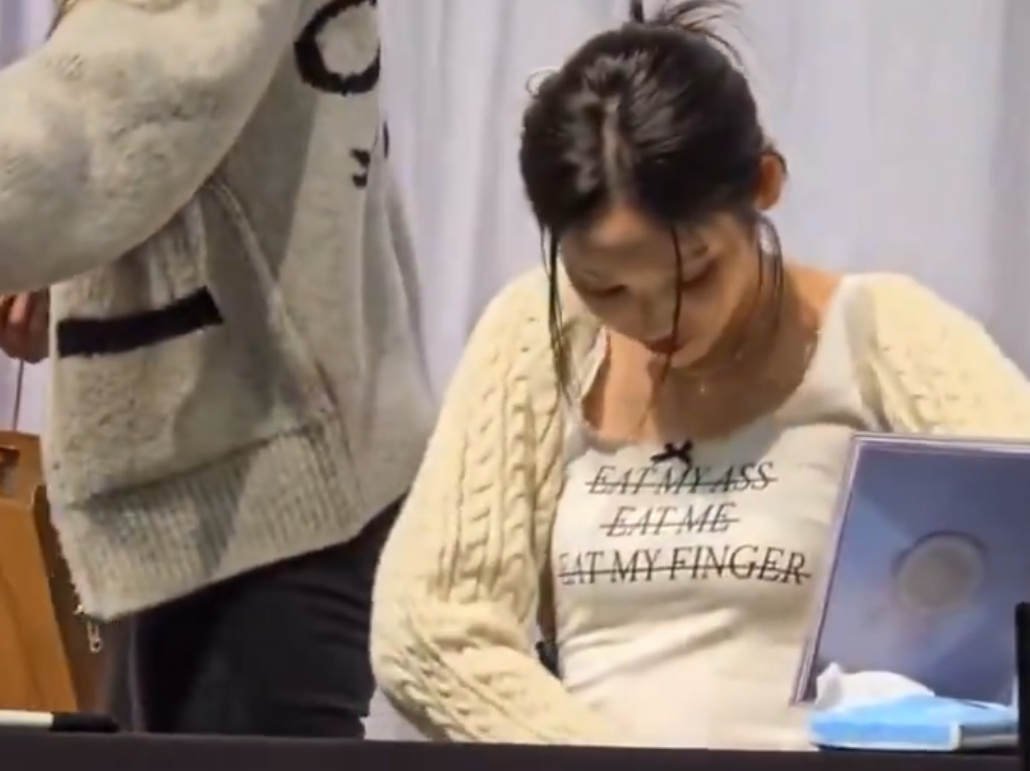 Over a year ago, PIXY member Sua wore a shirt with “EAT MY ASS, EAT ME, EAT MY FINGER” struckthrough on the front in an official performance video, and today I was proud to find out that ARTMS member JinSoul continued on tradition by rocking it at a fansign.