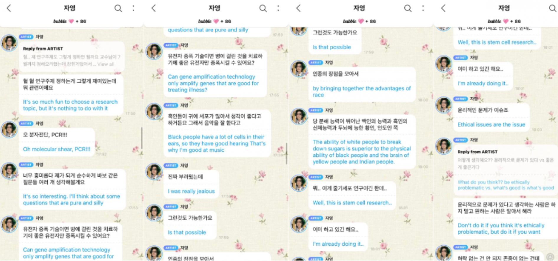 Anyway, JYP Entertainment boy band member Jun Han of Xdinary Heroes decided yesterday would be a good time to share his thoughts on racial “science” and promote eugenics with fans on Bubble, responding to a fan message about them doing research in school.